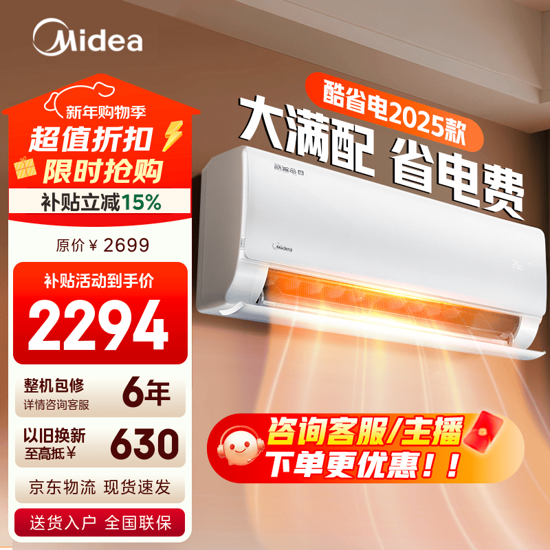美的空调 爆款推荐 酷省电 新一级能效 变频冷暖 节能省电家用卧室挂机 以旧换新 家电补贴15% 酷省电2025版 大1.5匹 省电25%