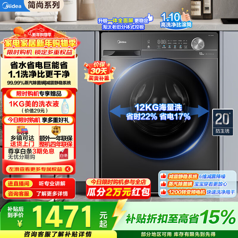 美的(Midea)12公斤滚筒洗衣机全自动家用大容量 1.1超高洗净比 除菌净螨 一级能效 简尚系列 家电换新补贴 MG120V36T