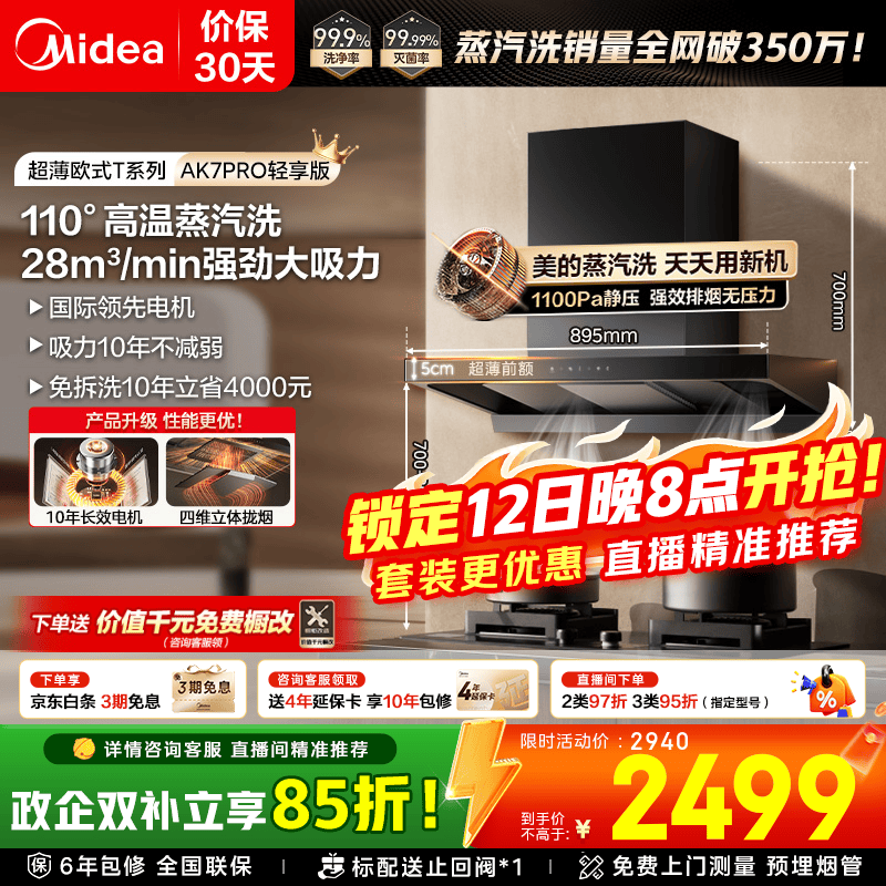 美的(Midea)【蒸汽洗AK7 T】欧式顶吸式抽油烟机28风量超薄变频增压 铜线电机1100Pa强排吸油烟机AK7Pro轻享版 【单烟机-双腔立体捕烟AK7 T】(支持鸿蒙智联) 烟灶智能联动