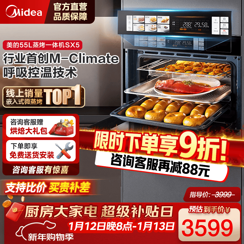 美的嵌入式蒸箱烤箱一体机SX5 55升专业蒸烤 杯水鲜蒸/温湿智控/涡轮热风/ 蒸烤炸炖4合1体机 SX5