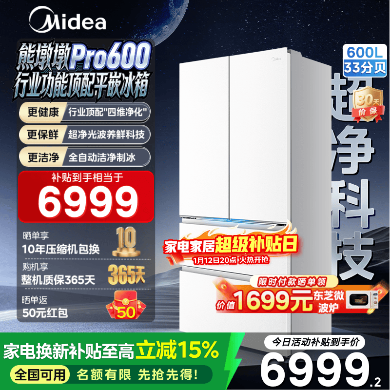 美的(Midea)熊墩墩Pro600升法式多门大容量超薄零嵌双系统双循环无霜保鲜一级能效 国家补贴(支持鸿蒙智联) BCD-600WUFIPZM(E)海贝白