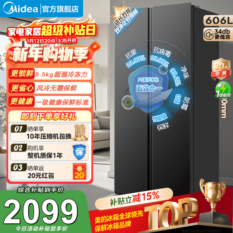 美的(Midea)606L大容量对开门电冰箱双开门双变频一级能效节能省电全净保鲜科技家用超薄风冷无霜 国家补贴 美的冰箱606L